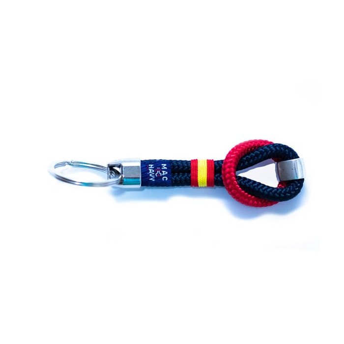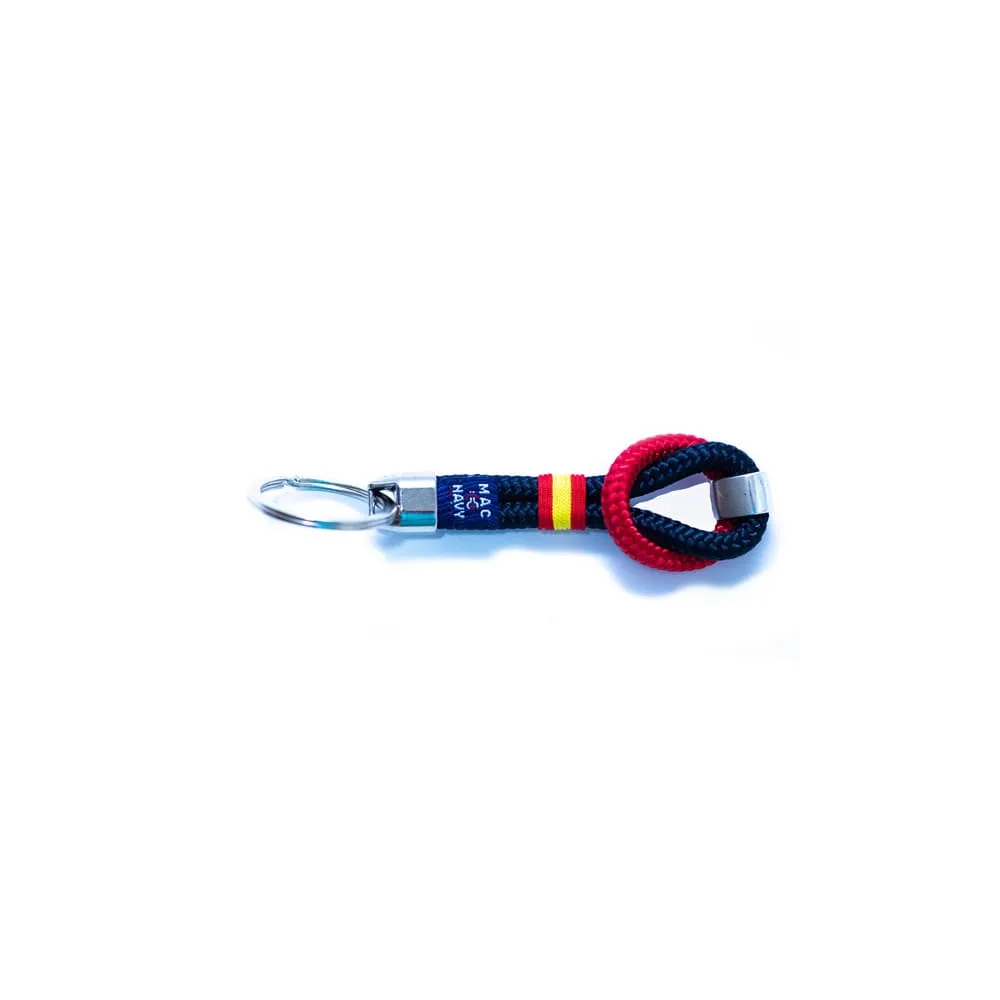 Este llavero náutico Mac Navy destaca por su nudo rojo decorativo, símbolo de la tradición marinera, y por su banda tricolor con la bandera de España. Un accesorio con personalidad, ideal para los apasionados del mar o como regalo distintivo con carácter patriótico y artesanal.