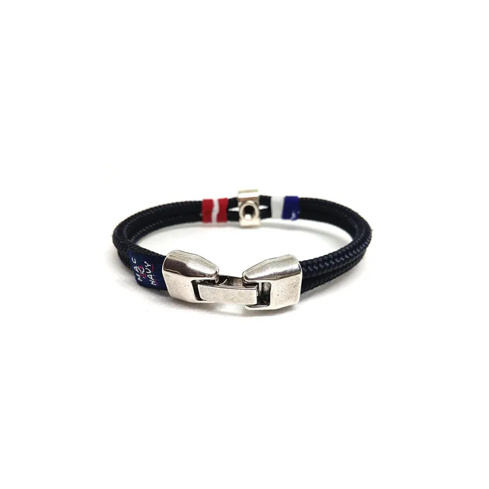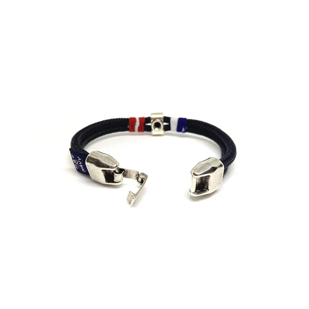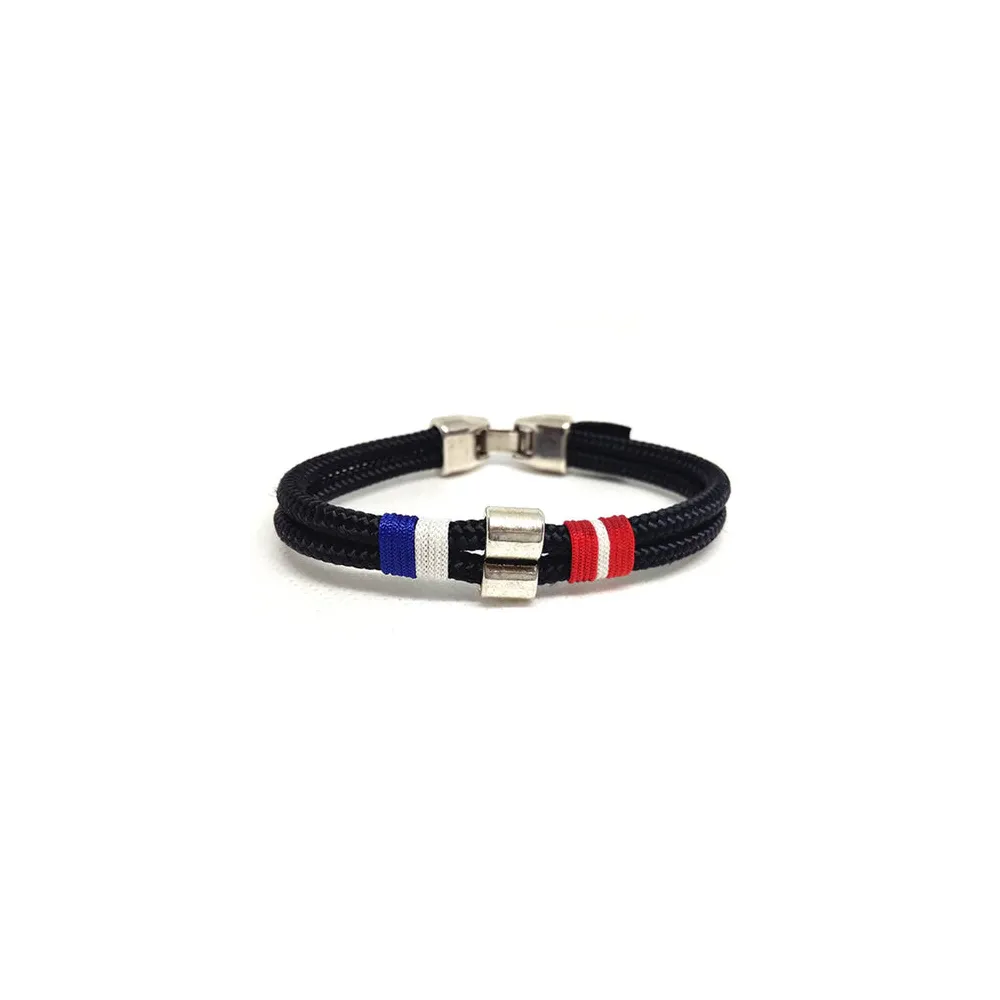 Diseñada para los amantes del mar profundo y el estilo funcional, la Pulsera Dive Paralela Cincada es una pieza robusta y elegante. Su cuerda náutica negra de doble vuelta se adorna con bandas de color azul, blanco y rojo que evocan la bandera de buceo internacional.