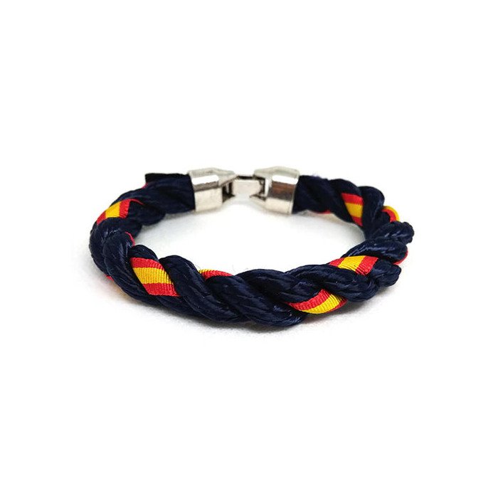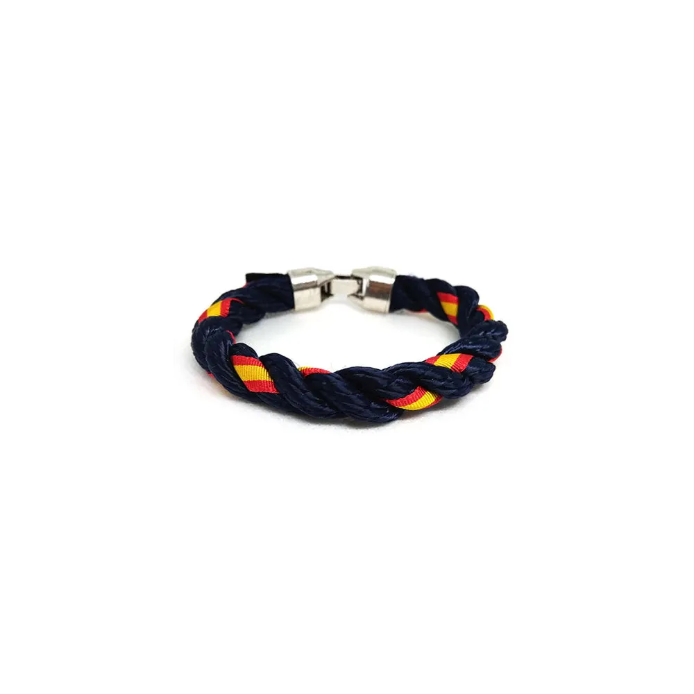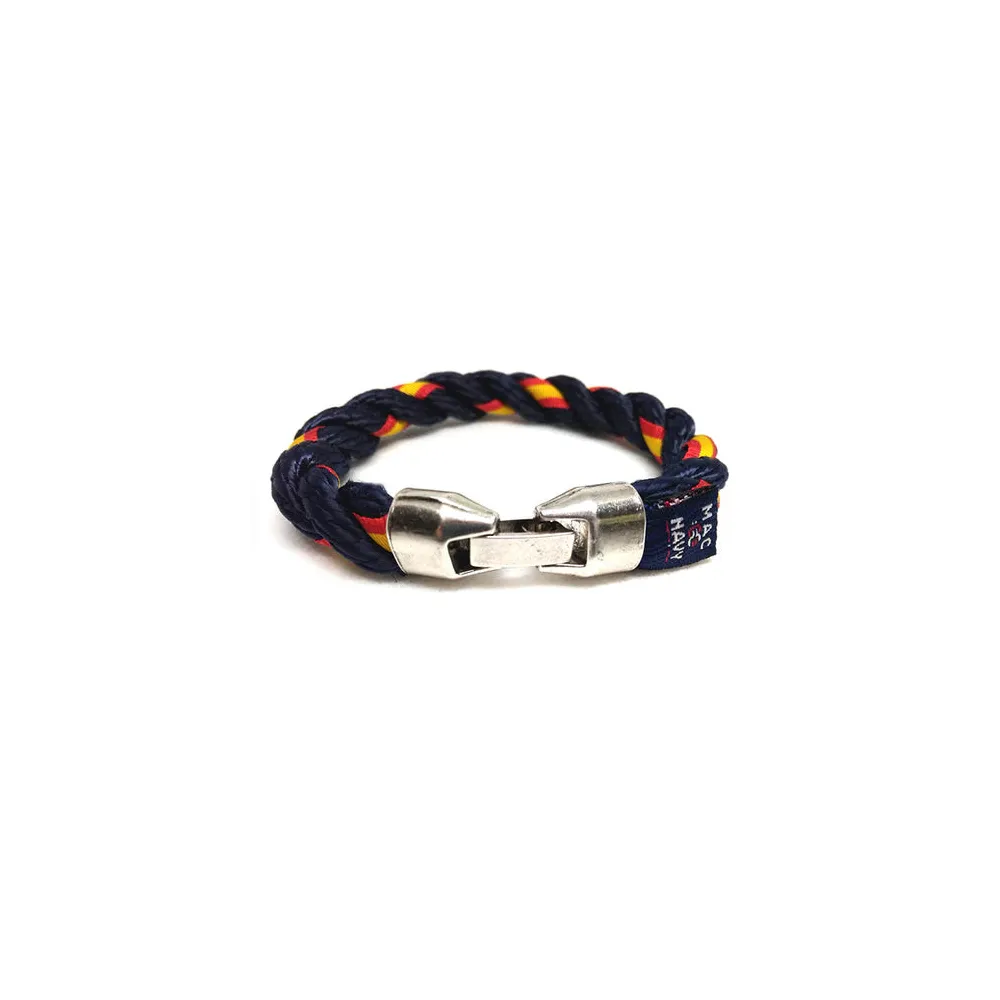 La pulsera AM-Fondeo es un tributo al arraigo, al valor y a la firmeza de quienes echan el ancla sin perder el rumbo. Su trenzado grueso, elaborado con cuerda náutica azul marino y cinta textil con los colores de la bandera de España, simboliza fuerza y compromiso. Inspirada en los cabos de fondeo, esta pieza recoge la esencia de lo clásico con una actitud contemporánea.