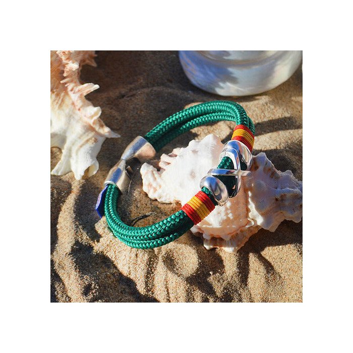 La pulsera Hole Driza Verde con detalles de la bandera española es una pieza única que fusiona identidad, color y diseño náutico. Su cuerda trenzada en verde intenso transmite frescura y conexión con la naturaleza, mientras que los hilos en rojo y amarillo abrazan el anillo metálico central, evocando el orgullo de llevar España siempre contigo.