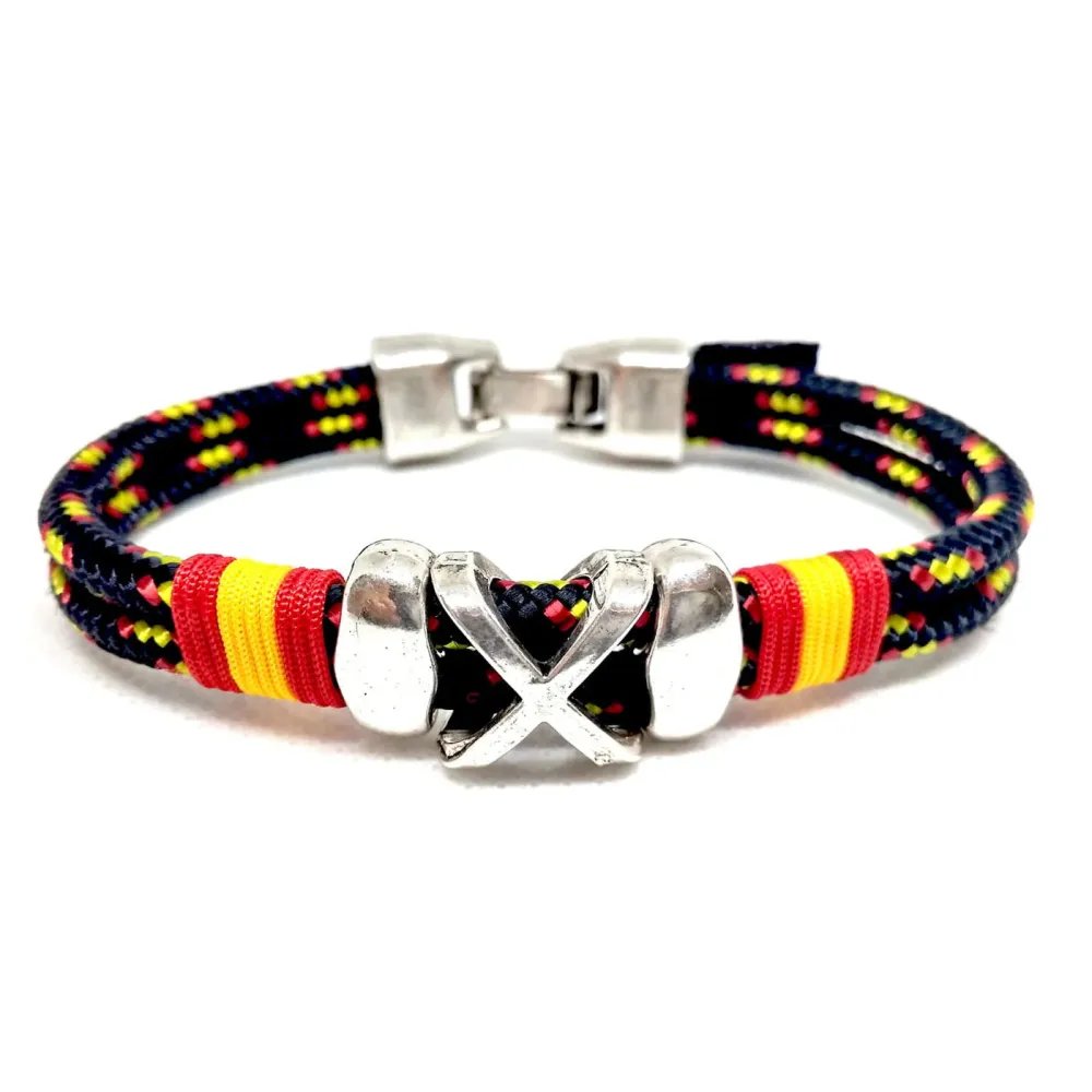 Con esta pulsera Hole X Jaspeada, destaca con un diseño moderno que combina estilo, carácter y orgullo nacional. Su doble cuerda trenzada en azul marino jaspeado con rojo y amarillo transmite vitalidad y conexión con el entorno náutico. El elemento central en forma de "X" metálica aporta un toque contemporáneo y distintivo.
