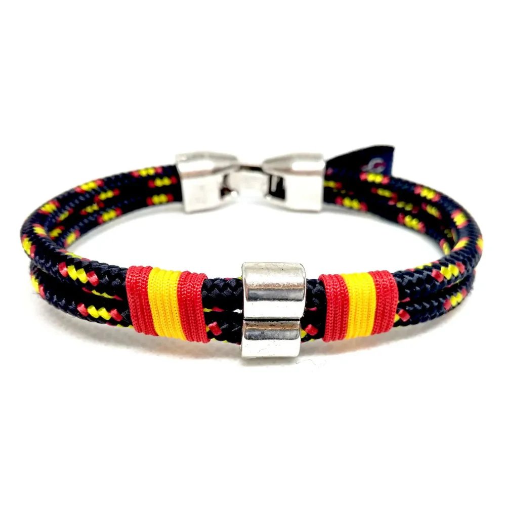 Con esta pulsera paralela cincada jaspeada, celebra la fuerza del mar y el orgullo de nuestros colores. Su doble cuerda trenzada en azul marino con detalles jaspeados en rojo y amarillo refleja el dinamismo y la energía del entorno náutico. La franja central con la bandera de España simboliza la unidad y el compromiso con nuestras raíces.
