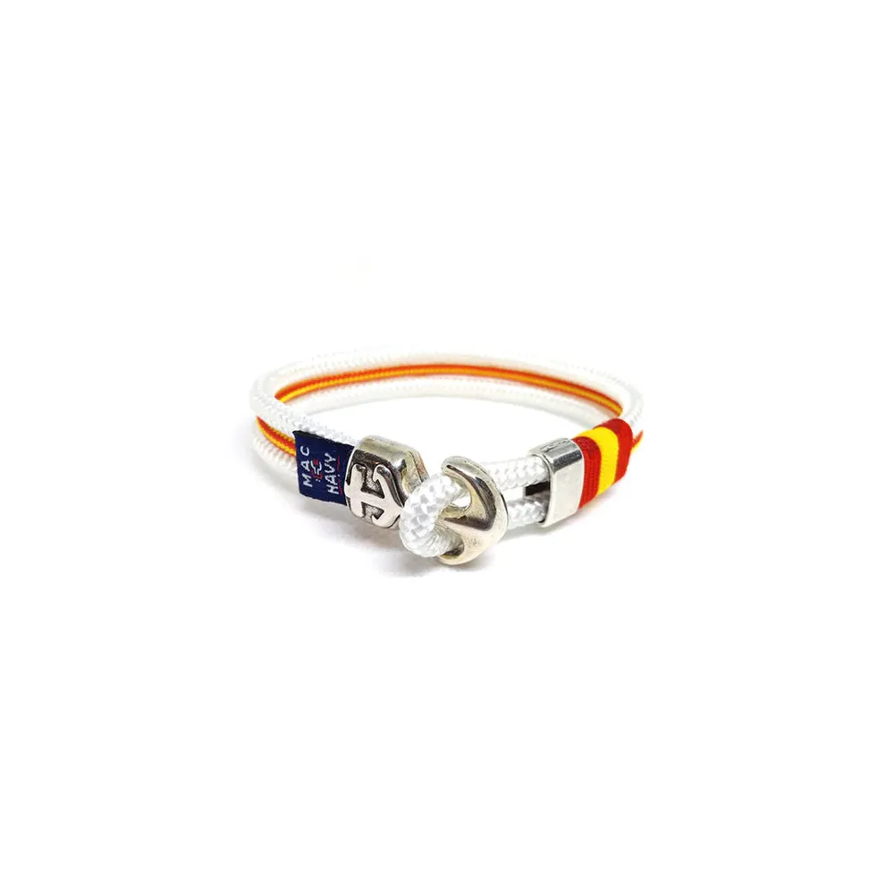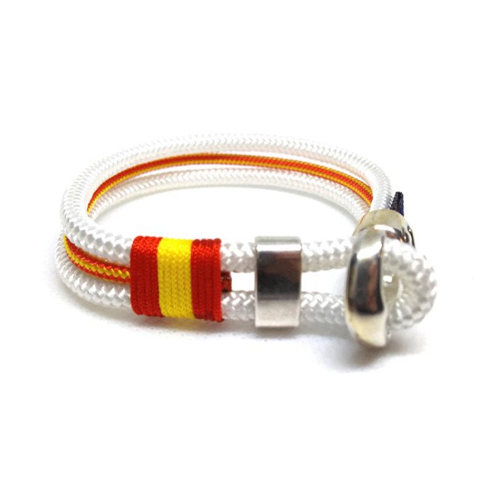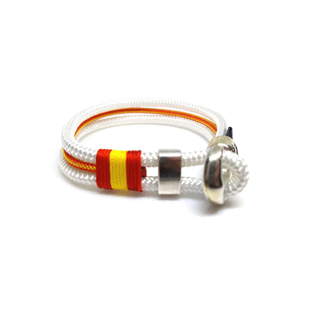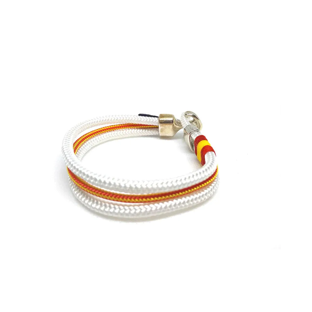 Celebra el 20º aniversario de uno de los eventos náuticos más prestigiosos de España con esta pulsera oficial del Trofeo SM La Reina. Confeccionada a mano con cuerda náutica blanca de alta resistencia, destaca por su sobriedad, su elegante cierre en forma de ancla y la emblemática banda en los colores de la bandera de España.