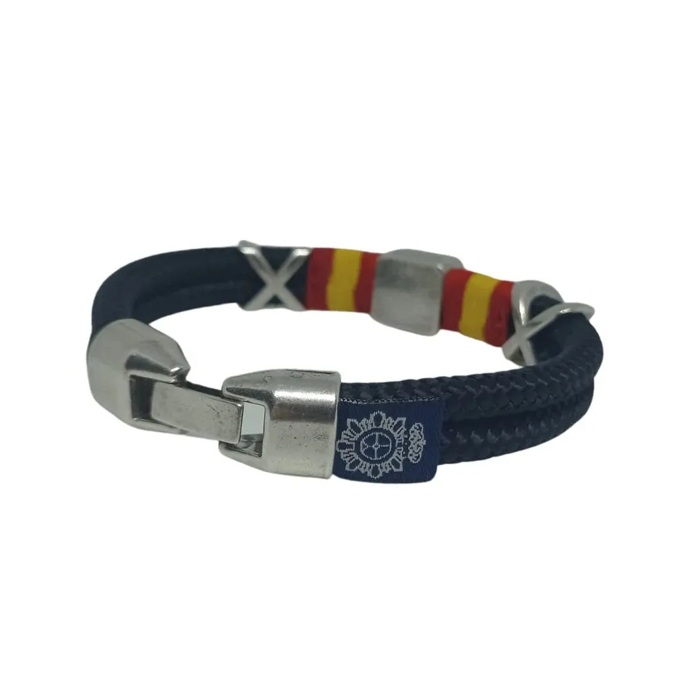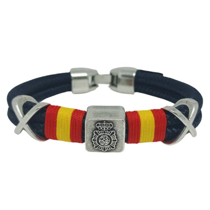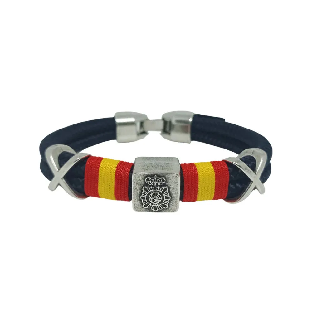 Luce con orgullo tu apoyo a quienes velan por la seguridad de todos con esta pulsera oficial de la Policía Nacional. Fabricada en resistente cuerda náutica azul marino, incorpora los colores de la bandera de España y un cubo metálico central con el escudo grabado de la Policía Nacional.
