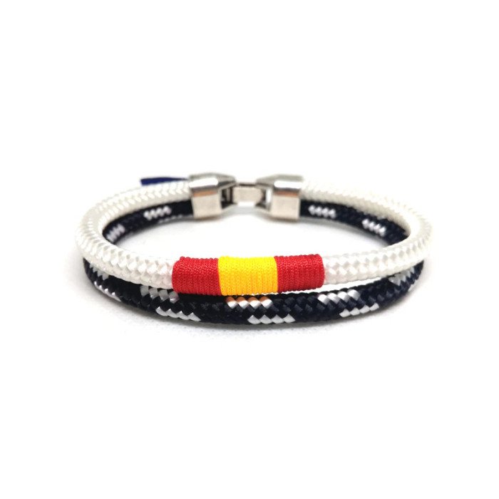 Inspirada en el uniforme de patrulla, esta pulsera náutica representa el compromiso y el servicio de los agentes municipales. Elaborada con doble cuerda de alta resistencia en tonos blanco y negro, incorpora una banda central con los colores de la bandera de España, destacando el orgullo y la unidad nacional.