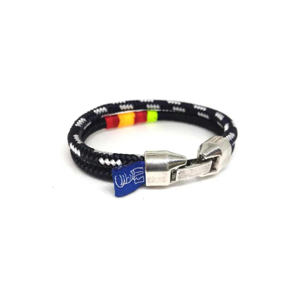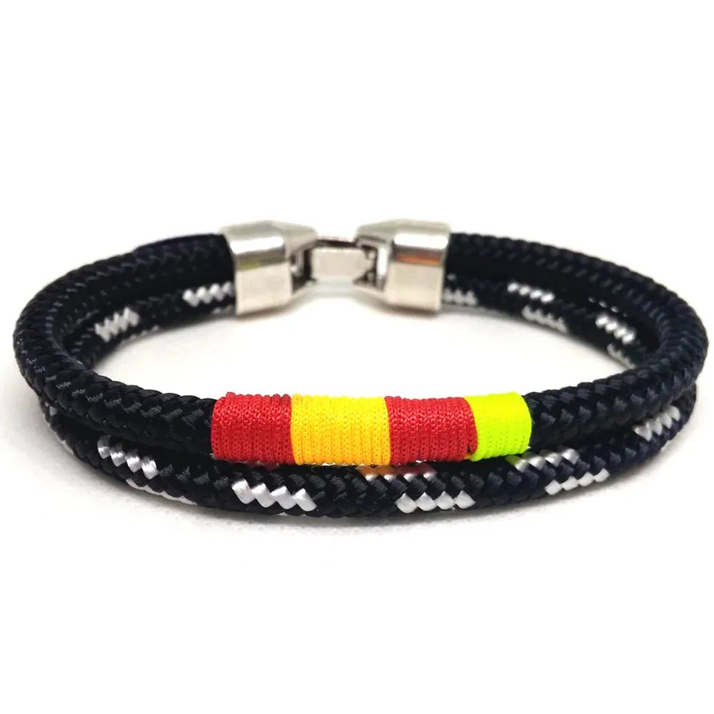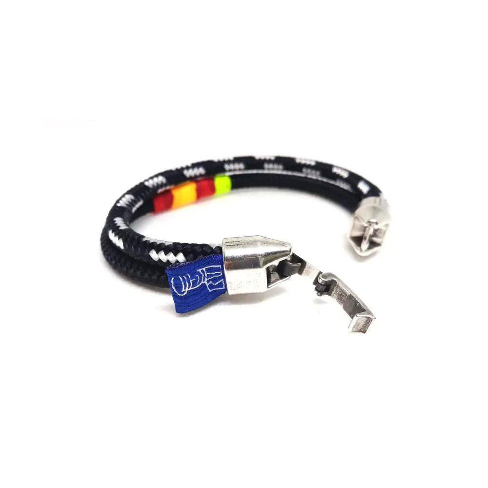 Rinde homenaje a los agentes de tráfico con esta pulsera institucional de Mac Navy, diseñada para reflejar compromiso, visibilidad y orgullo profesional. Su doble cordón náutico en azul marino con detalles en blanco evoca firmeza y precisión, mientras que la banda reflectante en rojo, amarillo y verde flúor representa los colores de señalización propios de la circulación vial.
