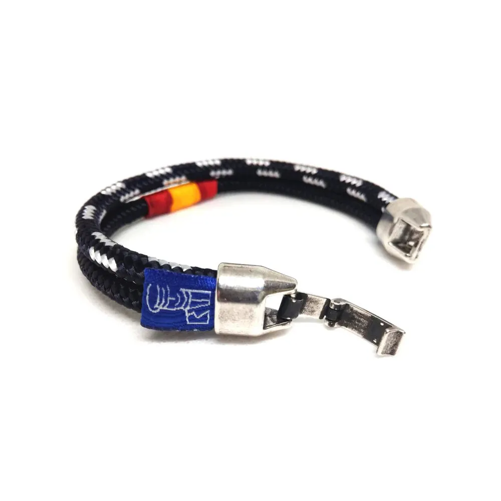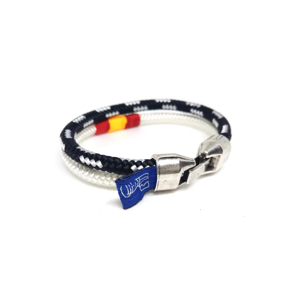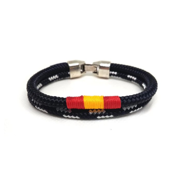 Esta pulsera náutica representa con elegancia el compromiso y la labor diaria de las agentes de la policía municipal. Su diseño combina cuerdas negras con detalles en blanco, evocando la uniformidad tradicional, mientras que la cinta roja y amarilla en el centro aporta identidad nacional.